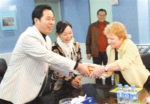 2005年,园岭小学校长梅仕华代表学校向美国版画家访华团长赠送《园岭版画》精品集。