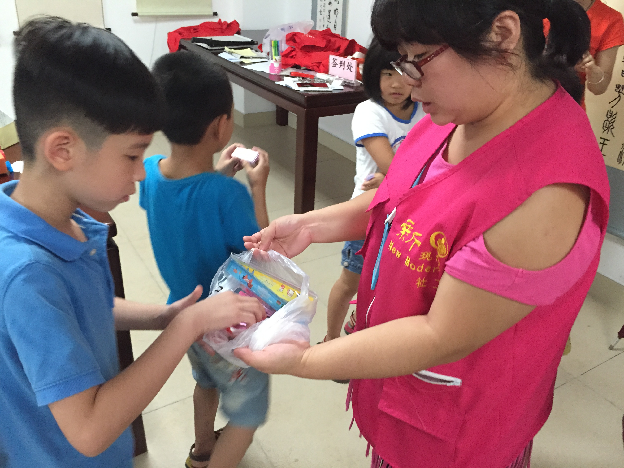 社工给小朋友发放手工制作需要的物料