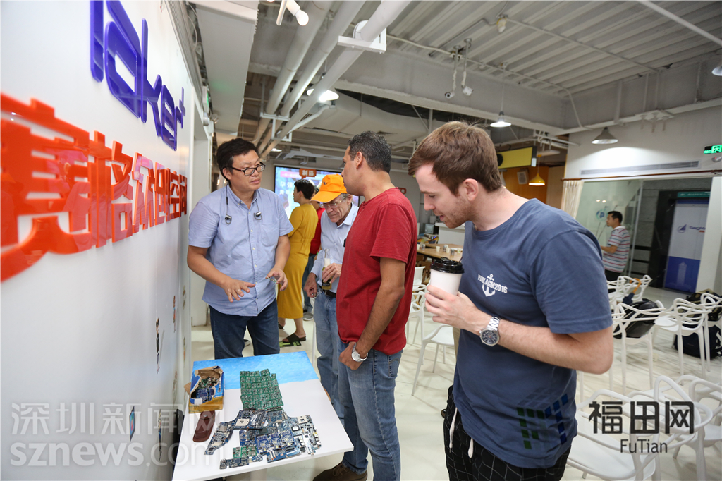 一位中国创客在向几位国际创客介绍自己的产品。