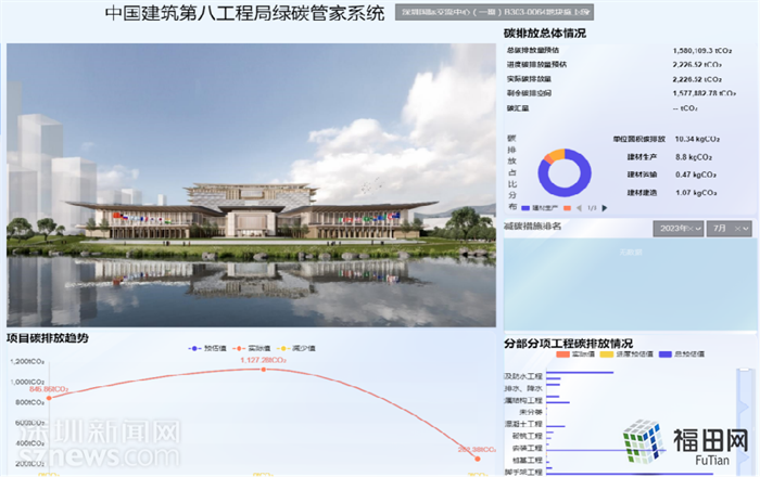 除光储直柔的低碳能源应用外,项目在施工全周期还植入了12项碳减排技术,形成从材料、工艺到管理的立体化绿色体系,并应用绿碳管理平台,全程监测碳排放情况。在材料端,创新采用天然石粉、碳纤维模板等绿色建材,从源头减少污染排放;在施工环节,采用钢管混凝土顶升技术降低现场浇筑能耗,运用建筑扫地机器人、焊接机器人等智能设备,减少返工产生的工业废料。