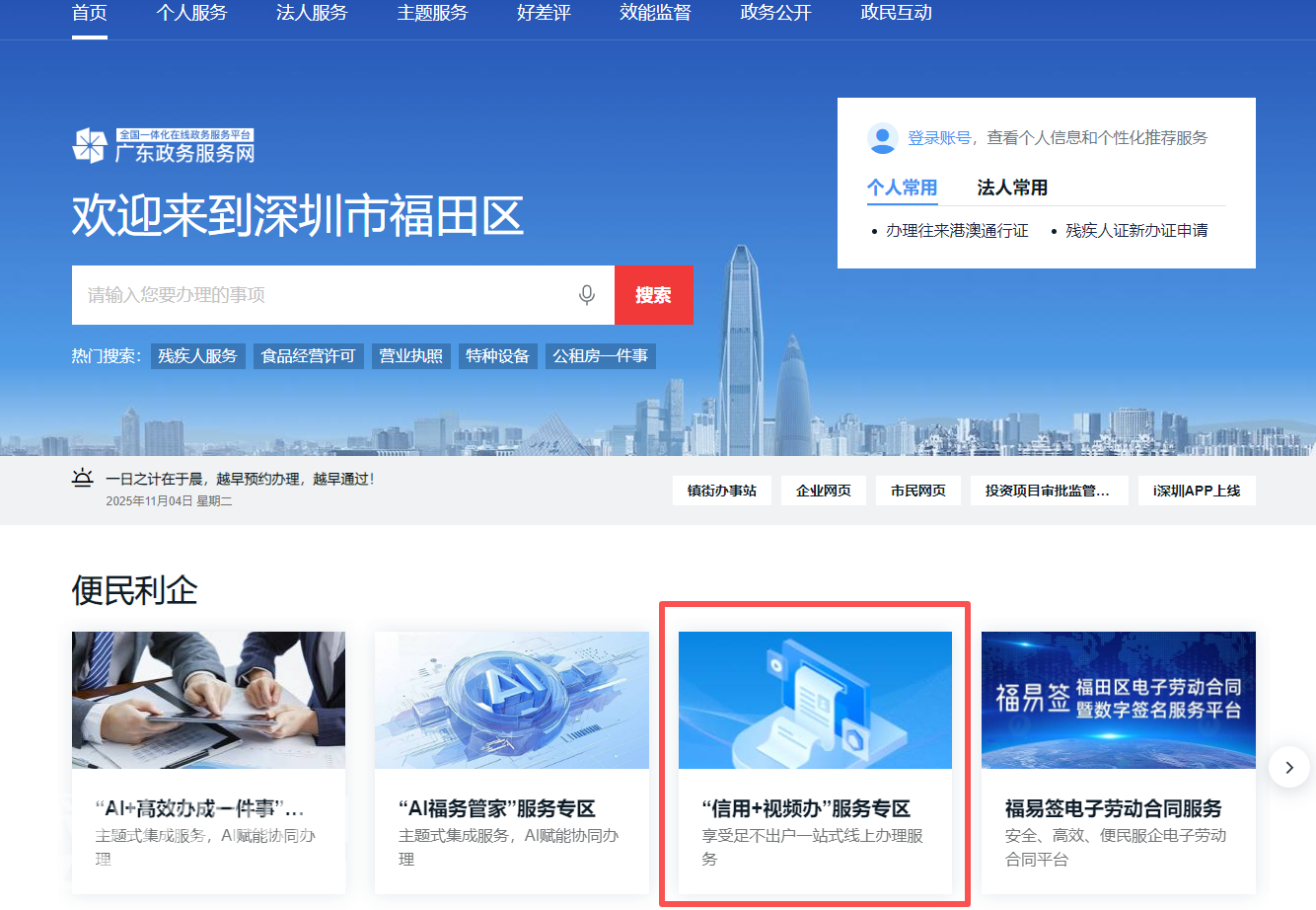 福田区在全市首推政务服务“信用+视频办”改革,通过“信用承诺+视频核验”方式,推出335项“信用+视频办”事项,教师资格认定、医师护士执业注册、福田英才荟律师人才奖励等高频事项在全市唯一实现“零跑腿”视频全流程办理,411项政务服务事项实现即来即办,即办件比率、减办理时限全市领先。