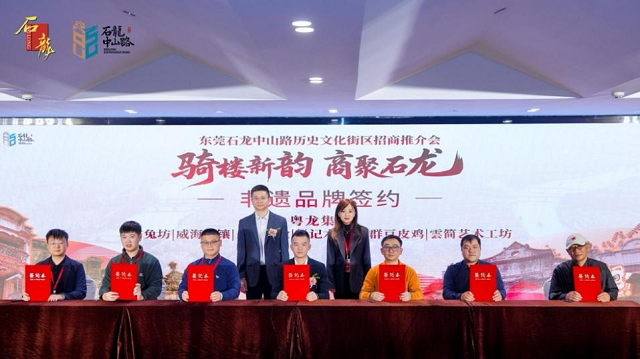 随后开展的签约仪式是整场活动的焦点,包括非遗、餐饮、文娱商户以及酒店在内的多个品牌分三轮与石龙中山路历史文化街区达成协议,正式开启了合作共赢的新篇章。吉兔坊、威海锡镶、八马茶业、松记木雕等十余家非遗项目入驻,夯实街区文化底蕴,助力打造“东莞非遗第一街”;米禾寿司、椰香益品、海明公馆、书店、优家民宿、猫的天空之城等餐饮文创品牌,为街区注入浓郁的生活气息,带来丰富的消费体验;东呈集团隐沫酒店的签约,标志着街区深度旅游服务能力得到全面提升,多元业态共同构建起“文旅+消费”的完整闭环。