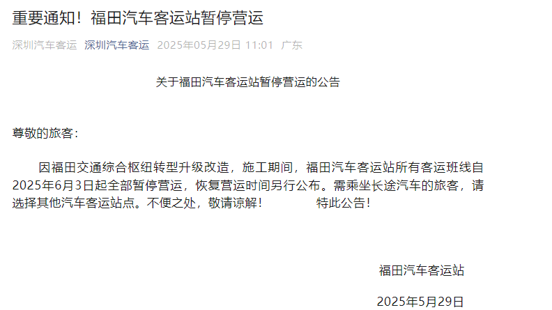 因福田交通综合枢纽启动转型升级改造工程,福田汽车客运站自6月3日起暂停所有客运班线营运,恢复时间将根据施工进展另行公告。...2025-06-03 16:05:00