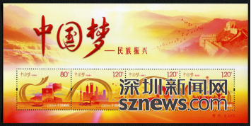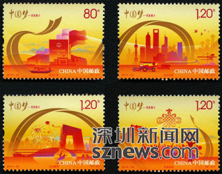 “中国梦”系列邮票第二套《中国梦-民族振兴》特种邮票,全套邮票包括邮票4枚,小全张1枚。邮票图名分别为政治文明、经济发展、文化繁荣、民族团结,全套邮票面值4.40元,小全张售价6.60元。