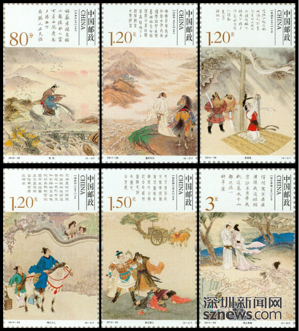 《元曲》特种邮票1套6枚,全套面值为8.90元。《元曲》特种邮票分别表现了元杂剧《窦娥冤》(关汉卿)、元杂剧《赵氏孤儿》(纪君祥)、元杂剧《倩女离魂》(郑光祖)、元杂剧《墙头马上》(白朴)、元散曲《山坡羊·潼关怀古》(张养浩)、元散曲《天净沙·秋思》(马致远)。全套邮票画面设计使用古版画,以期还原元曲的本质。