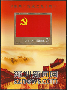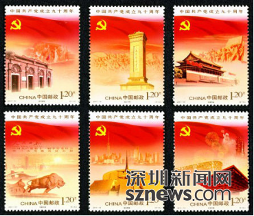 该邮票充分展现了中国建党90年来的光辉历史进程,纵向回顾,展现成就,憧憬未来。